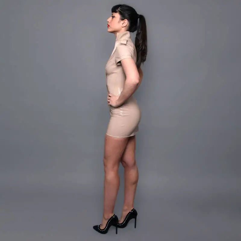 Que vous assistiez à une soirée ou que vous vouliez simplement vous sentir belle et audacieuse, cette robe de créateur en vinyle nude est un choix idéal. Elle est facile à porter, facile à associer et offre un look indéniablement tendance.