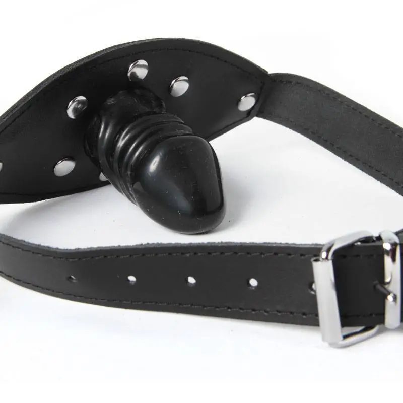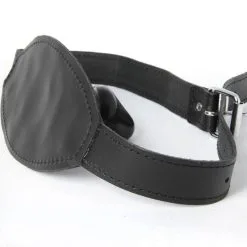 BĂąillon en cuir noir avec laniĂšre rĂ©glable ( 11 positions ) souple , composĂ© d’un pĂ©nis interne en latex sur une piĂšce de cuir large , plus rigide et rivetĂ©e .