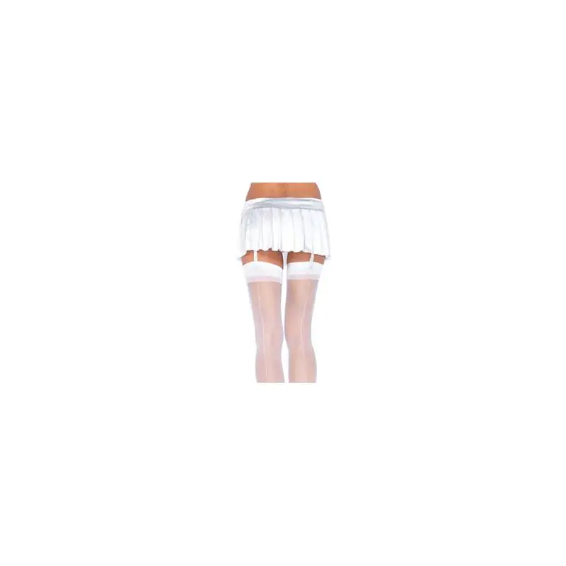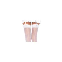 Bas blancs de la marque Leg Avenue avec bandes larges au niveau de la cuisse et couture blanche sur l’arrière de la jambe.