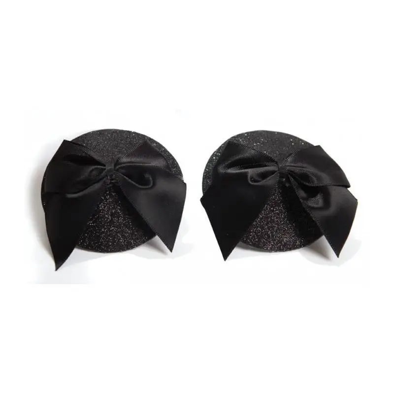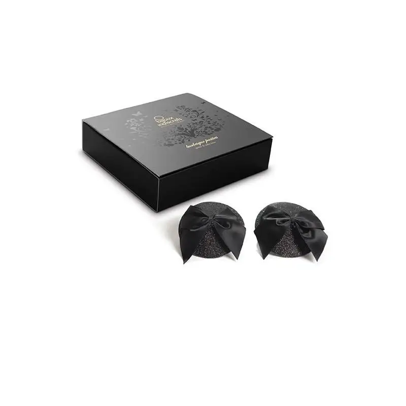 Cache tétons de Bijoux Indiscrets adhésifs et réutilisables. (il vous suffira de nettoyer la partie adhésive avec un savon au ph neutre et de laisser sécher) Ils sont agrémentés de petits noeuds en satin noir en leur centre.