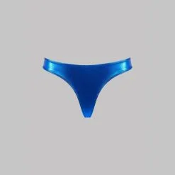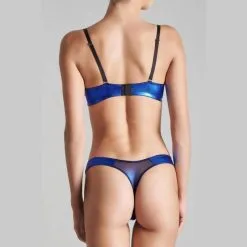 String taille basse échancré sur les côtés microfibre bleu brillant à l’avant et pièce en tulle métallique à l’arrière