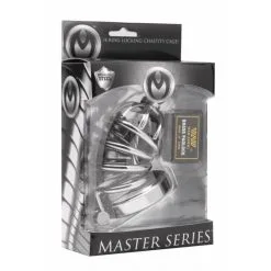 Cage de chasteté réalisée entièrement en acier inoxydable et dotée d’un anneau de verrouillage à sa base. Cet anneau comporte un manchon en caoutchouc au niveau du joint, empêchant ainsi tout pincement.
