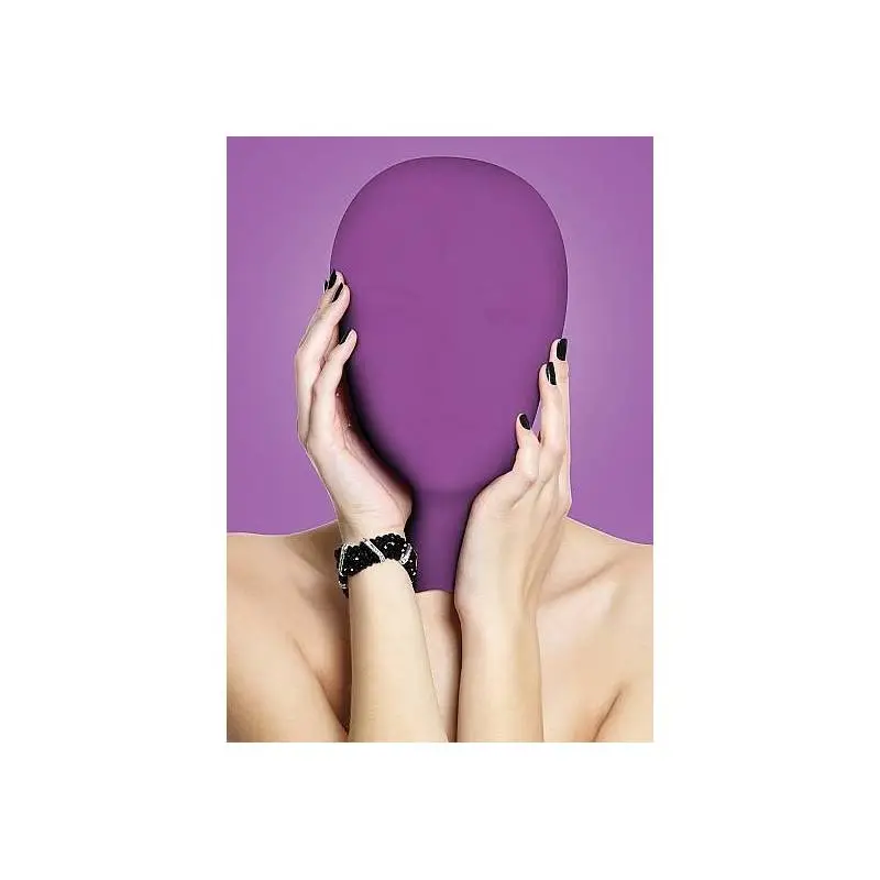 Cagoule en tissu soyeux légèrement extensible de couleur violet . AUCUNE ouverture. Système de fermeture/ouverture par zip sur l’arrière de la cagoule.