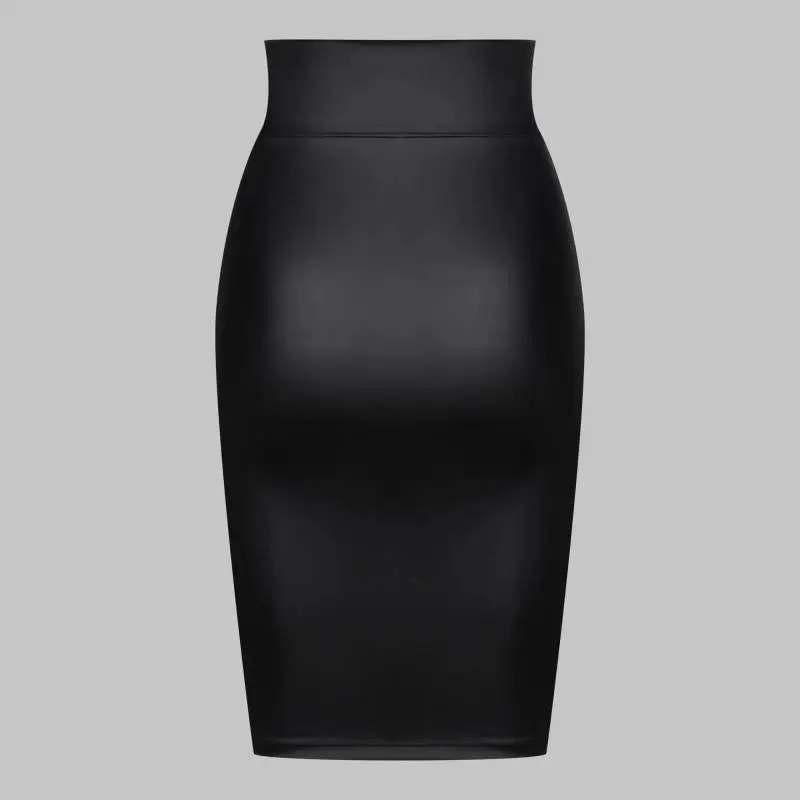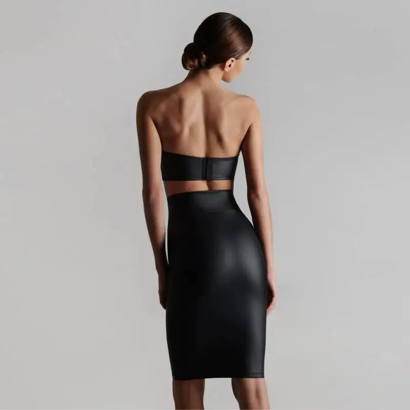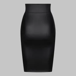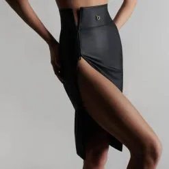 Jupe effet-cuir mat. Coupe très ajustée et large ceinture qui souligne la silhouette. Ouvrable à l’avant par un zip ton sur ton à double sens. Signature de la collection, un anneau « féti-chic » doré orne le devant et suggère l’attachement.