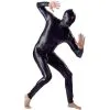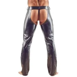 une chaps noire avec une fermeture éclair à double sens sur l’intérieur des jambes et un string assorti – tous deux en similicuir légèrement élastique.