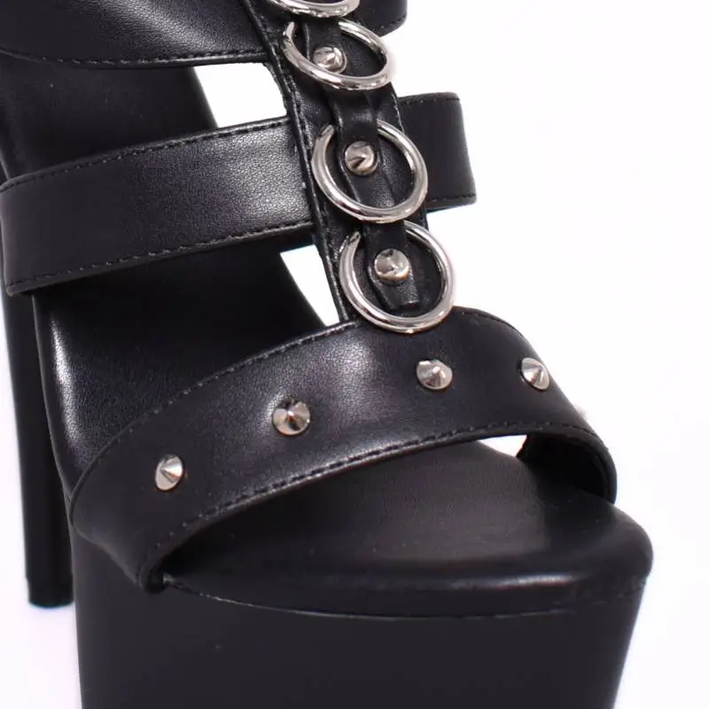 Le talon de 15cm et la plateforme de 5cm allongent vos jambes et offrent une silhouette ultra dĂ©ssinĂ©e. Les clous rivetĂ©s et les anneaux chromĂ©s ajoutent une touche fĂ©tish qui ne manquera pas d’impressionner.