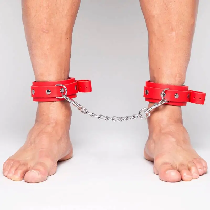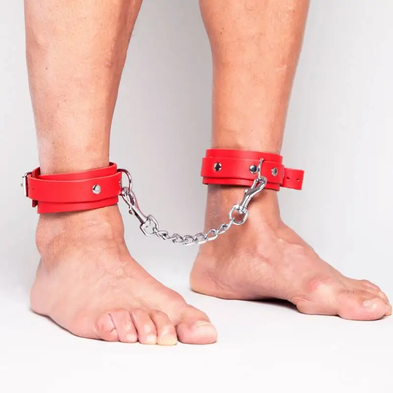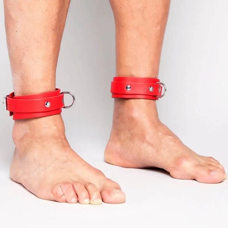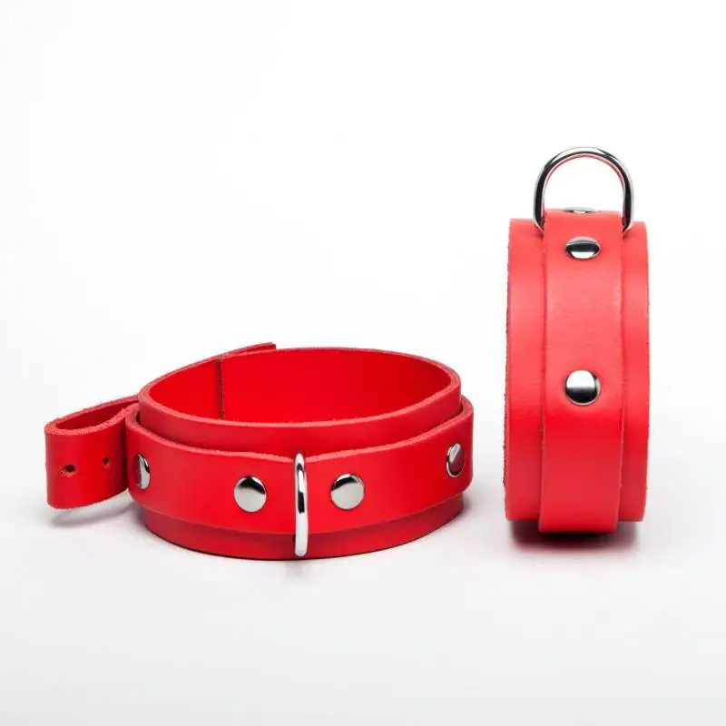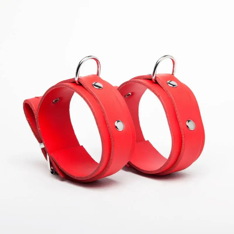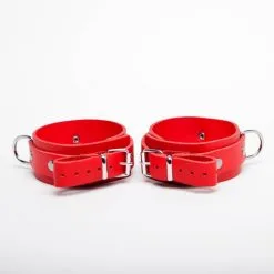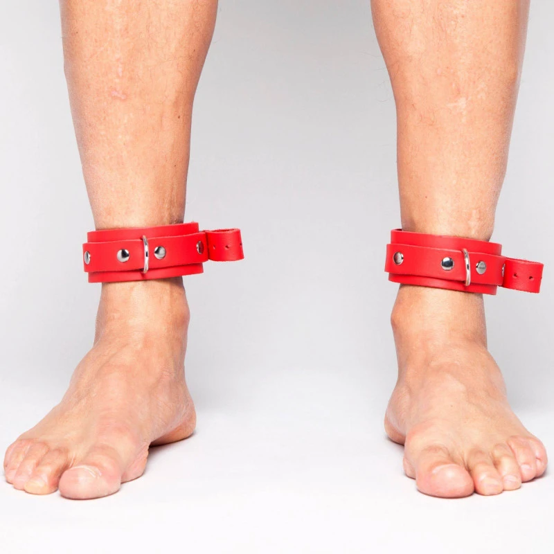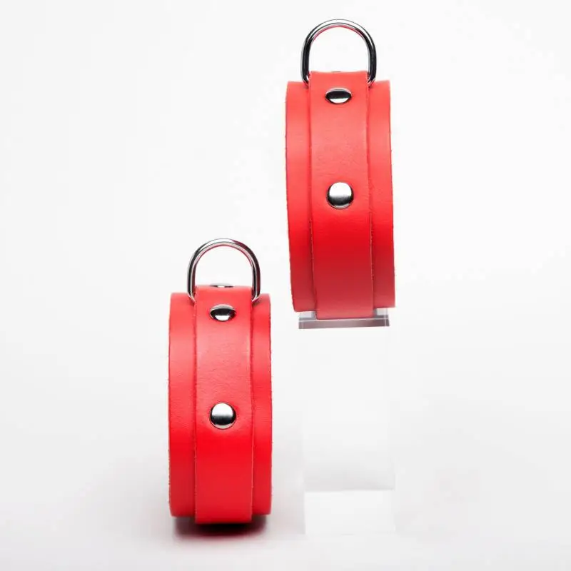 Chevillères fines en cuir rouge avec « sur » lanières rivetées et anneau métal, de la « collection DEMONIA ».