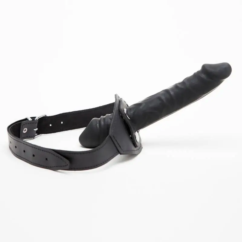 Bâillon en cuir noir à lanière souple disposant d’une boucle (11 positions possibles), et d’une pièce de cuir plus rigide sur l’avant avec un trou.