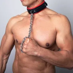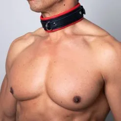 Collier en cuir noir/rouge de très bonne qualité avec une « sur » lanière rivetée et un anneau métal, de la « collection Dèmonia ».