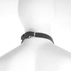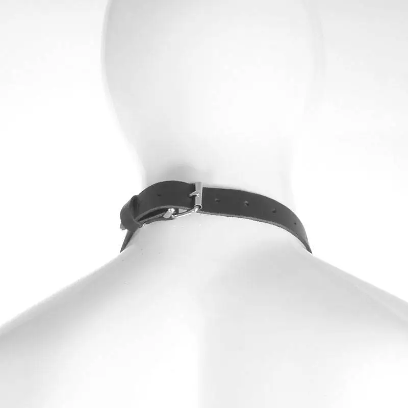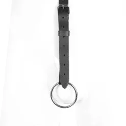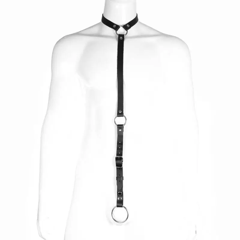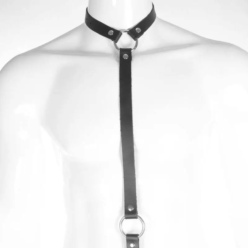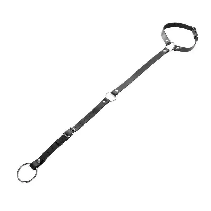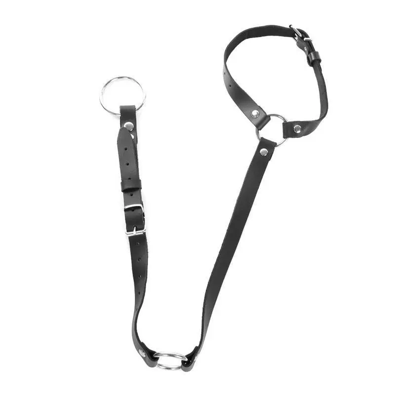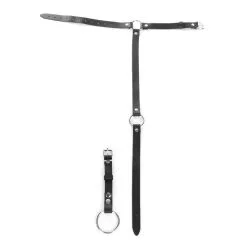 Tour de cou dotĂ© d’un simple harnais comprenant une sangle rivetĂ© rĂ©glable en cuir et un cockring