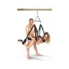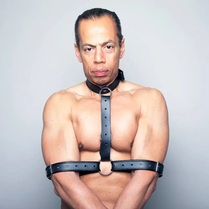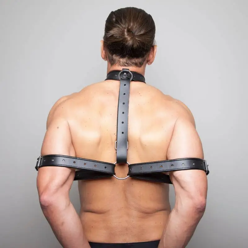 Le harnais de contrainte est conçu pour maintenir le partenaire dans une position de contrainte en bloquant ses bras à l’aide de lanières en cuir réglables reliées entre elles par des anneaux.