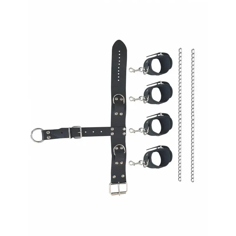 Superbe kit de contrainte complet offrant de multiples possibilités, il comprend un épais collier, deux paires de menottes pour poignets et chevilles ainsi que leur chaînes.