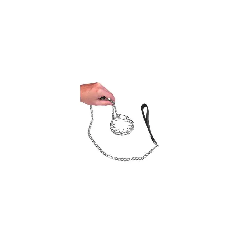 Laisse constituée d’une dragonne en cuir avec anneau riveté, duquel part une belle chaine en acier chromé à maille moyenne. A son bout un étrangleur à testicules !