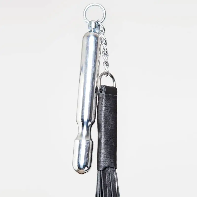 Martinet en cuir avec 16 laniÚres en cuir dur. Le manche est relié par une chaßne métal à un gode en alu, pouvant servir de poignée.