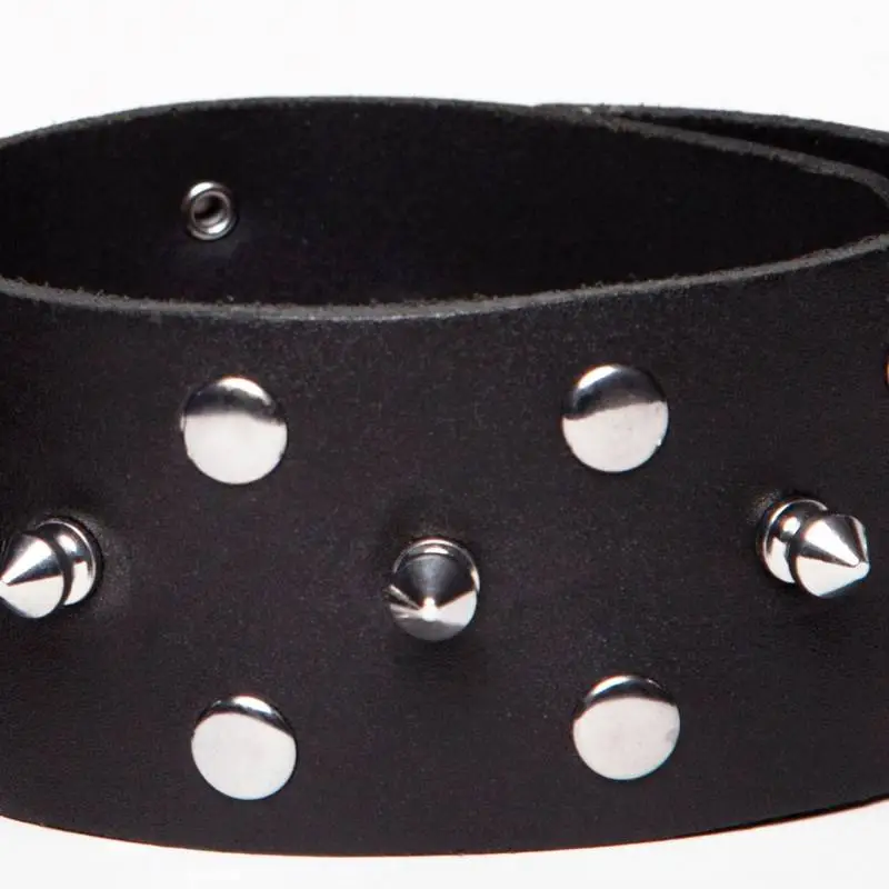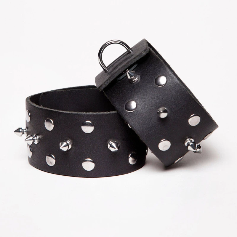 Cuir dur et épais pour ces chevillères parsemées de clous plats et de clous à pic.