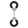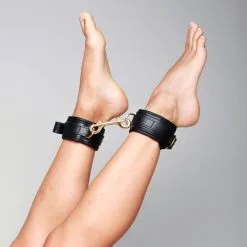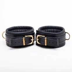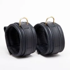 Chevillères molletonnées en cuir noir de la collection Dèmonia avec sur lanière doté d’un anneau doré.