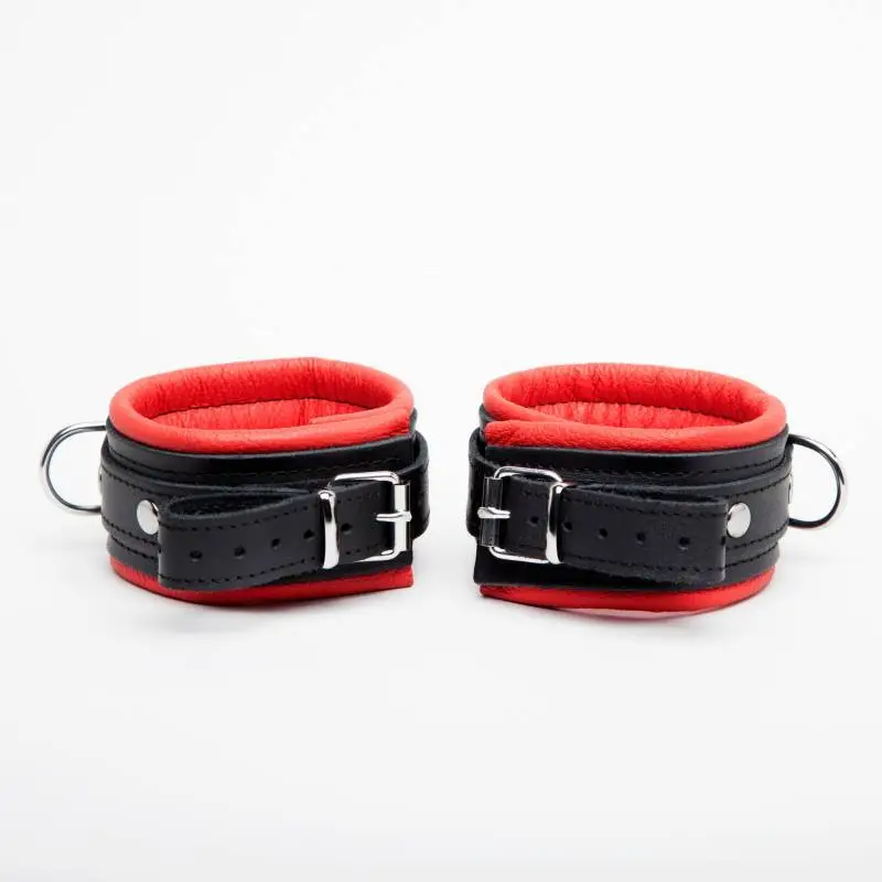 Très jolies menottes, molletonnées à l’intérieur avec une surface lisse, en cuir rouge, pratique et très confortable.