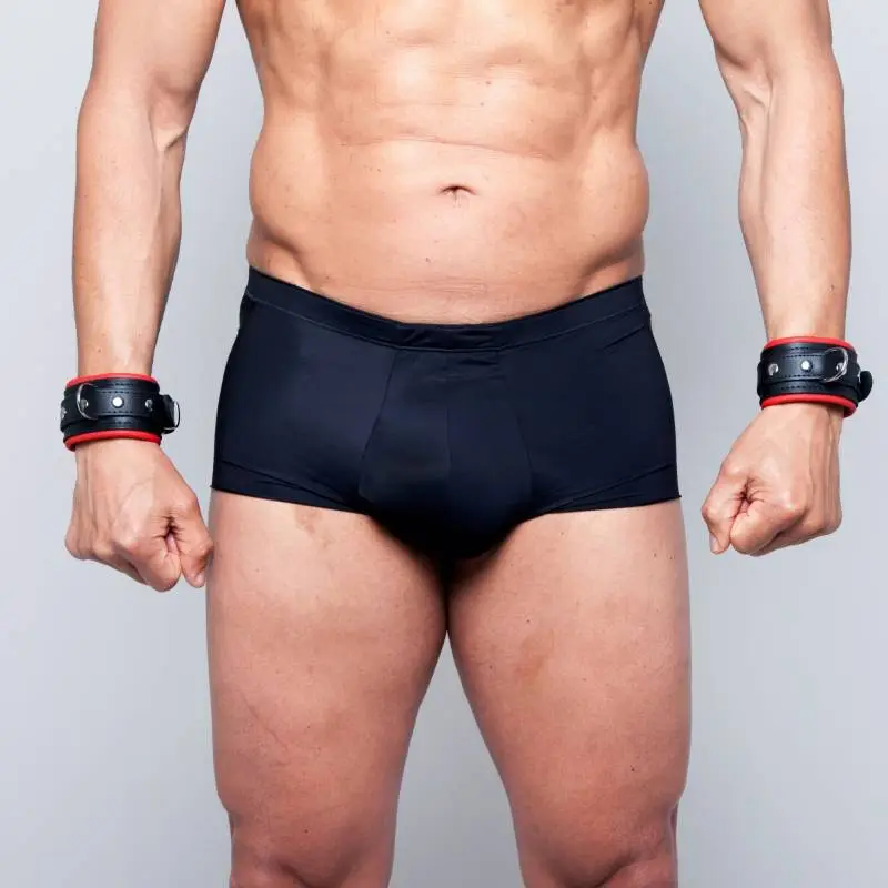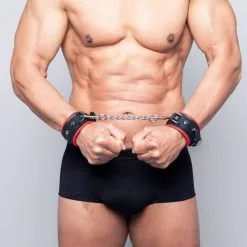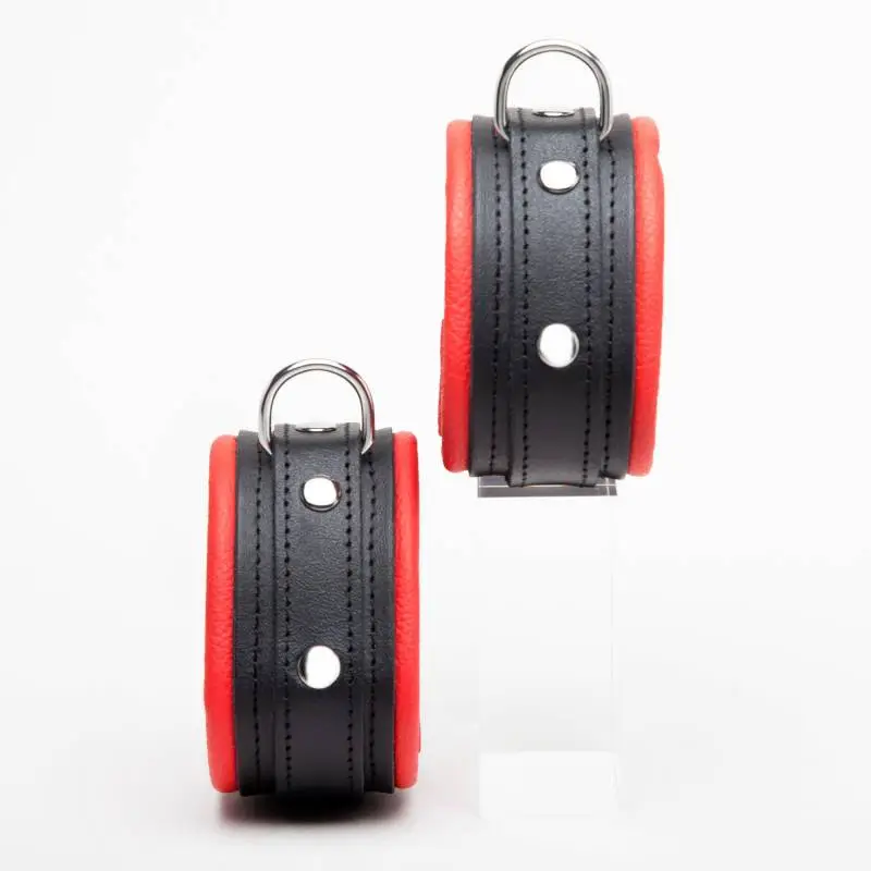 Menottes en cuir noir/rouge de très bonne qualité avec « sur » lanières rivetées et anneau de métal, de la « collection DEMONIA ».