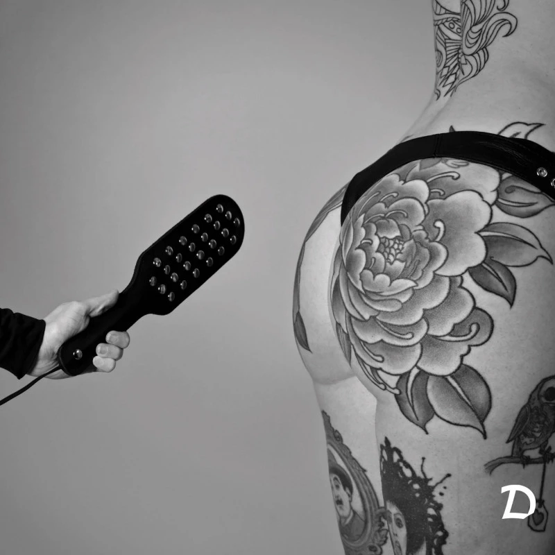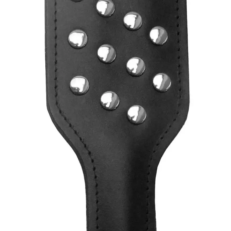 Petit paddle cuir avec rivets conducteurs pour électrostimulation.