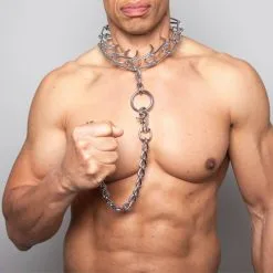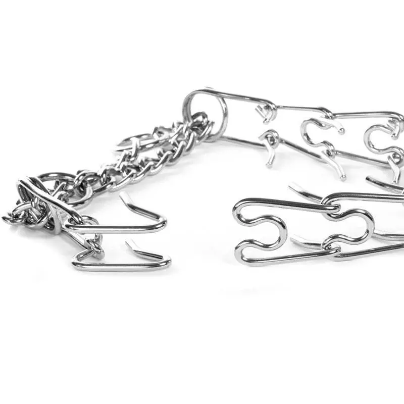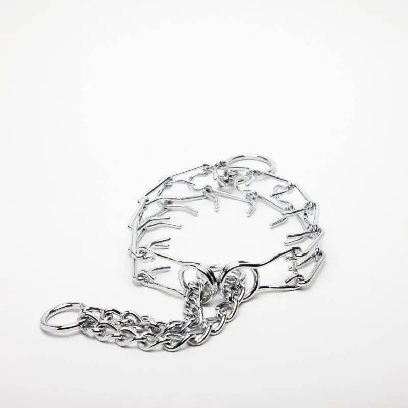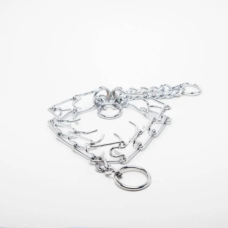 Ce collier Ă©trangleur en mĂ©tal est composĂ© de « dents » Ă l’intĂ©rieur, celles-ci se redressant lorsque l’on tire sur la laisse afin de resserrer l’Ă©tau.