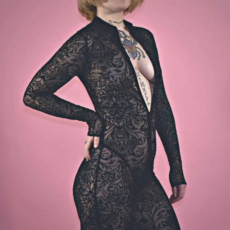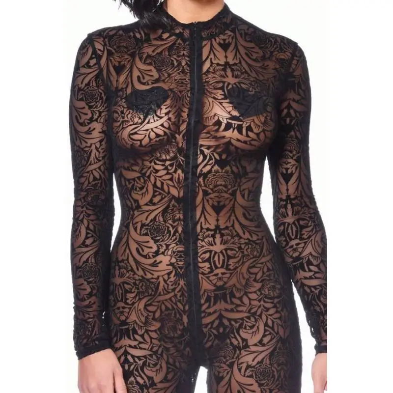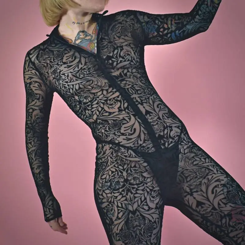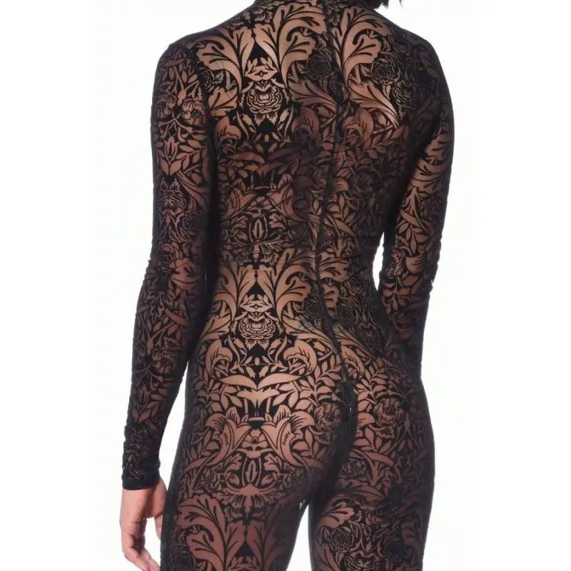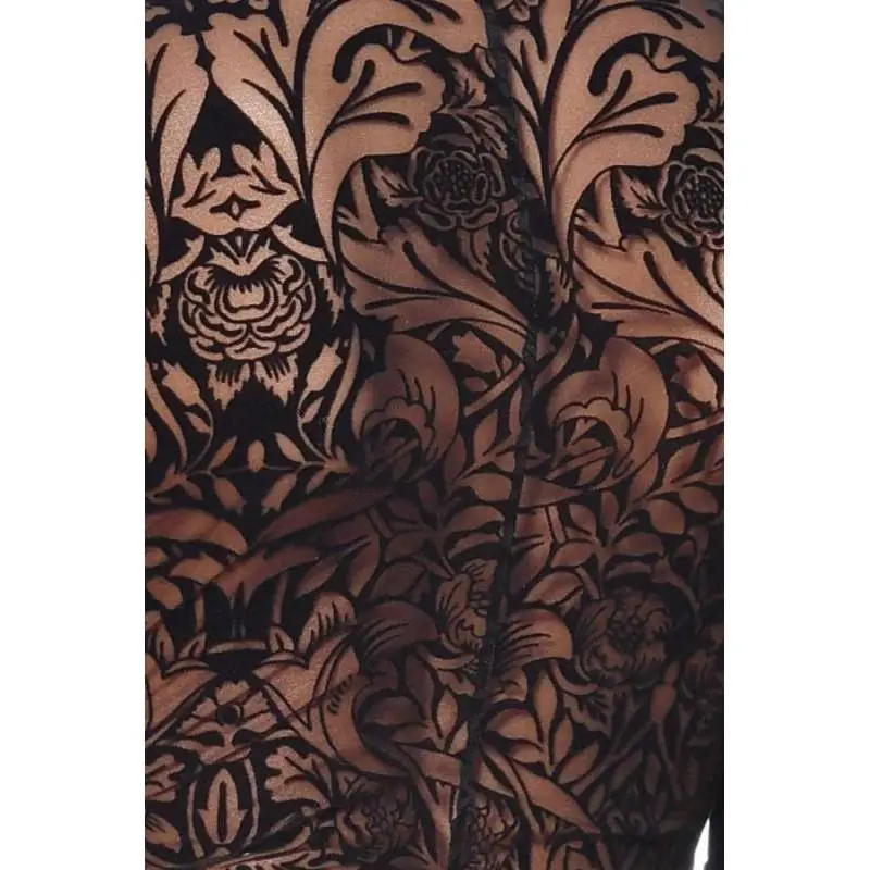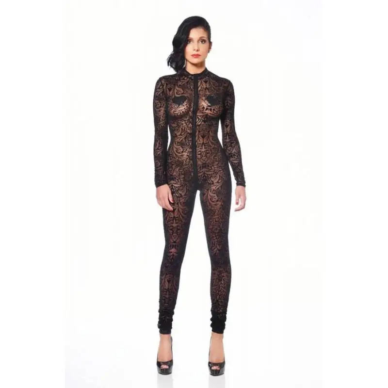 Fabriquée dans une résille flockée extensible avec un dessin inspiré des tatouages Maori. Combinaison à manches longues avec une fermeture à glissière invisible à deux curseurs, partant du col devant et allant jusqu’au milieu des fesses.
