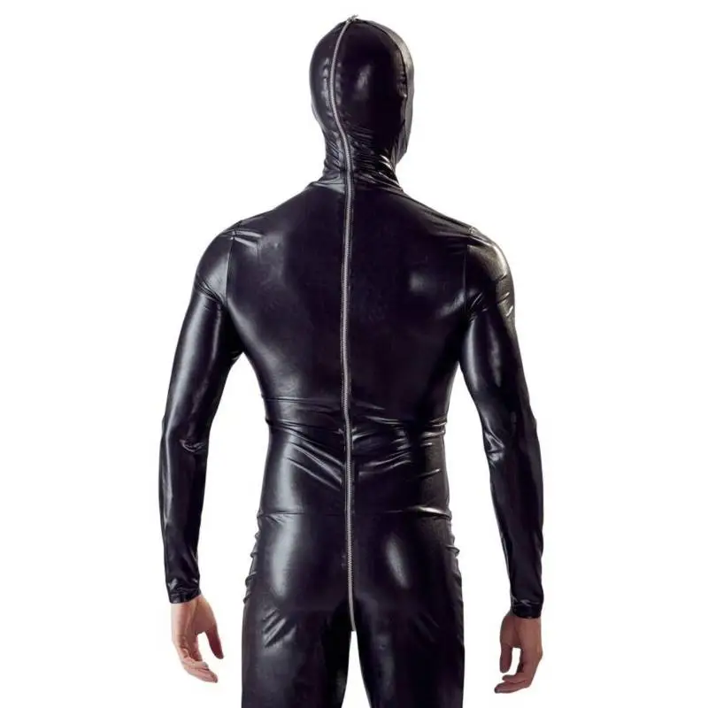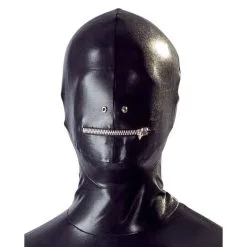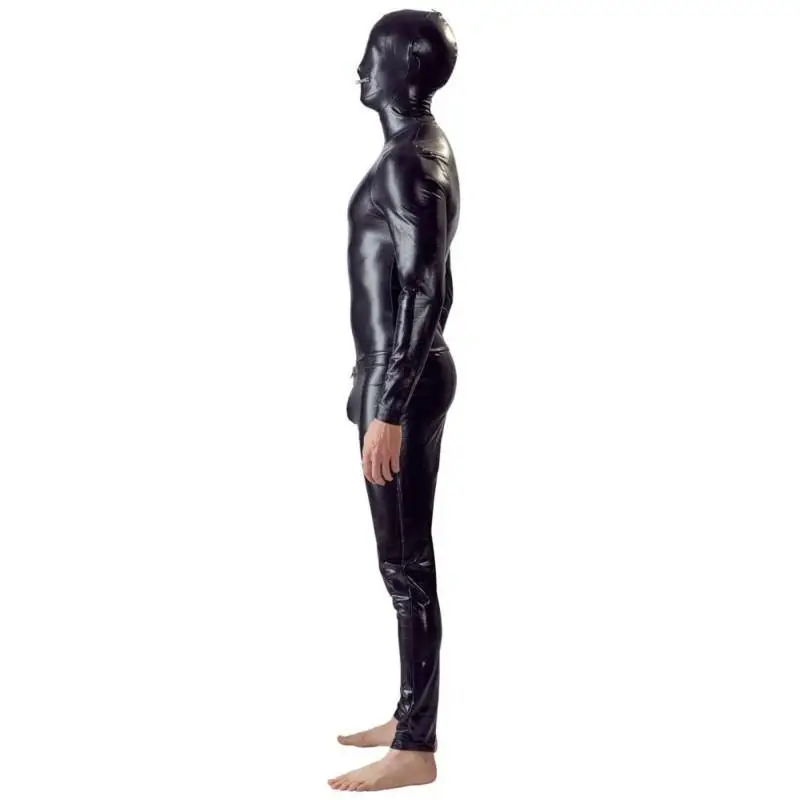 Il est muni d’oeillets pour le nez, d’une fermeture éclair à la bouche ainsi que d’une fermeture à double sens, qui passe par l’entrejambe, sur tout le dos et plus loin à l’arrière de la tête.