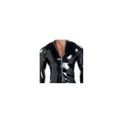Combinaison pour homme avec un long zip partant du cou et remontant jusqu’au niveau des reins avec 3 curseurs, et un zip Ă chaque manche au niveau des poignets.