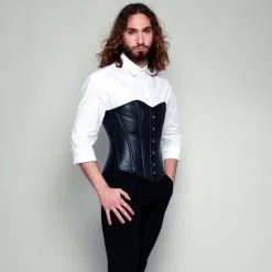 Corset en cuir épais noir avec baleines semi rigides, Ce corset est refermé par le devant par 6 crochets et dans le dos avec des lacets.