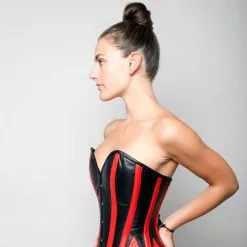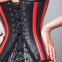 Corset en cuir noir et rouge qui prend la poitrine, bonne qualité, baleines semi rigides, refermé par le devant par 6 crochets et lacé dans le dos.