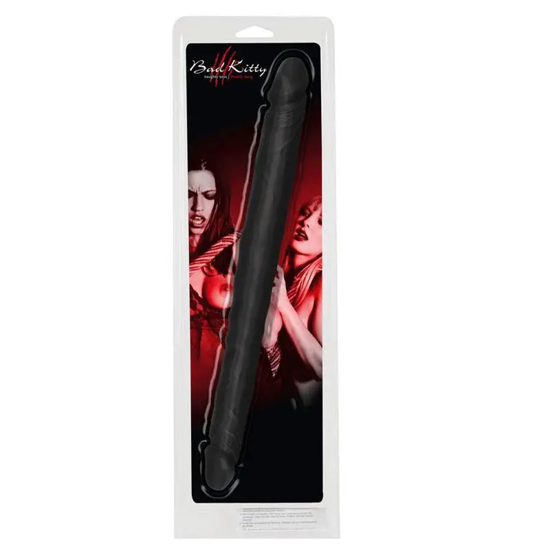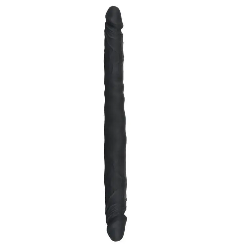 Double dong ultra flexible en silicone noir et extrêmement doux, nervuré imitant le pénis à chaque extrémité .