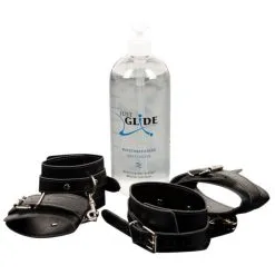 Inclut des menottes pour les mains et les pieds ainsi qu’un litre de lubrifiant !