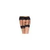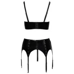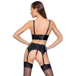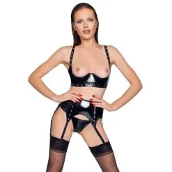 Le tout est entièrement laqué noir brillant avec des rivets décoratifs. Le porte-jarretelles et le porte-jarretelles sont fermés par des crochets à l’arrière. Les bretelles et les 6 jarretelles sont réglables en longueur pour un ajustement parfait.
