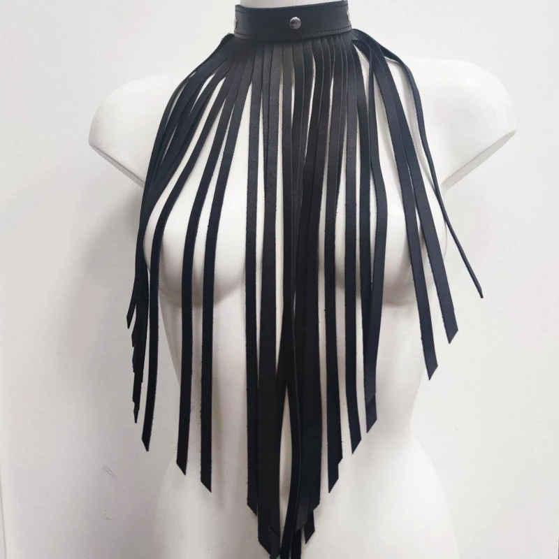 Stylisez vos tenues SM avec ce superbe collier en cuir noir rigide. Ce collier est conçu pour les amateurs de style SM qui recherchent un accessoire audacieux pour compléter leur look. Fabriqué en cuir noir de haute qualité, ce collier est doté de lanières en cuir tombantes qui ajoutent une touche de sensualité à votre apparence.