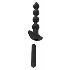 Kit anal en silicone noir composĂ© d’un plug classique , d’un plug chapelet (perles anales) et d’une douchette intime et d’un « bullet ».