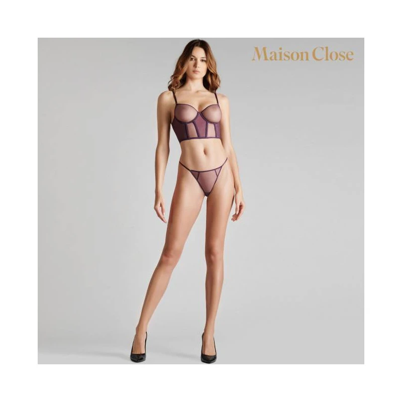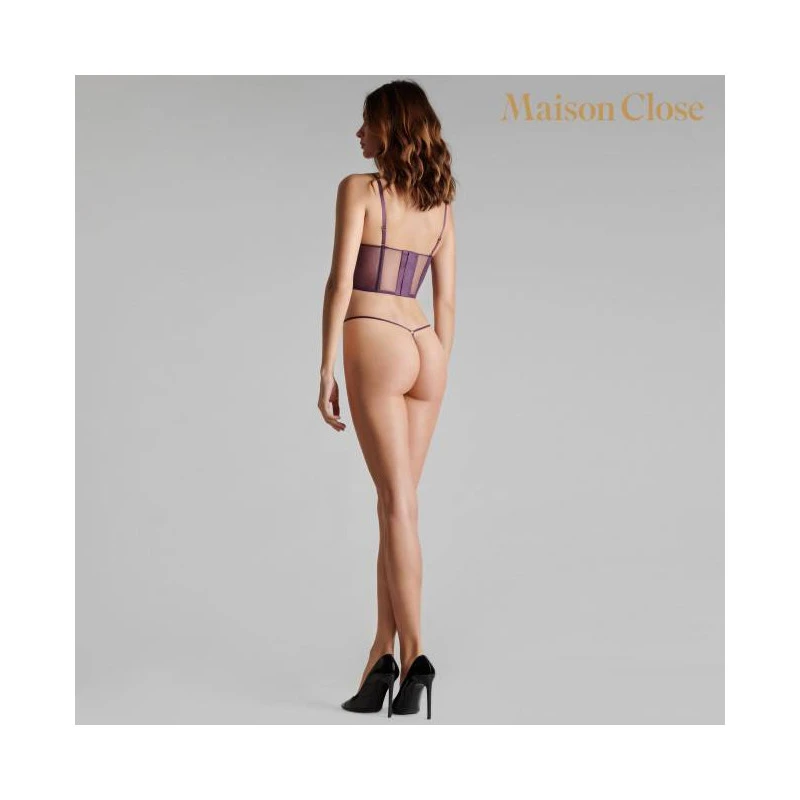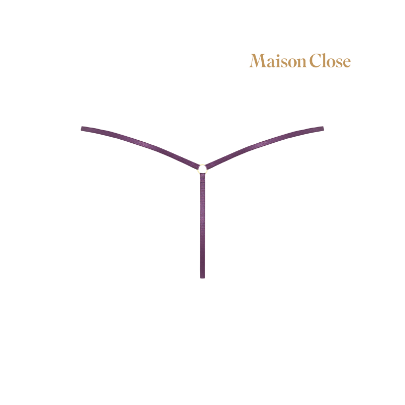 Mini string en tulle d’une transparence absolue. Bandes élastiques très fines reliées par un anneau doré au creux des reins.