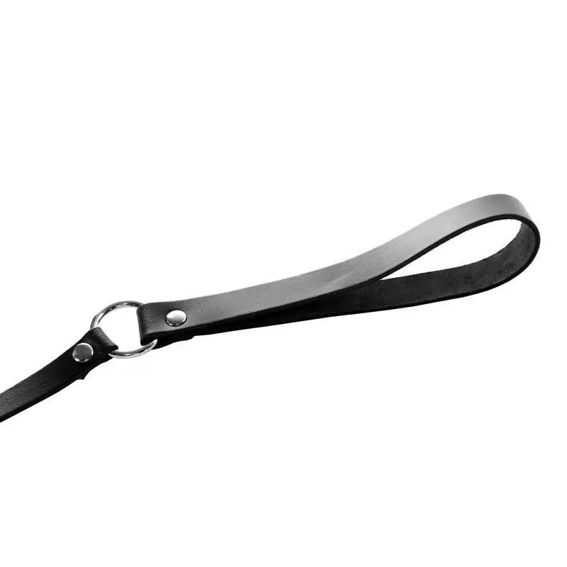 D’un coté, la dragonne de la laisse, à l’autre extrémité, un anneau chromé.