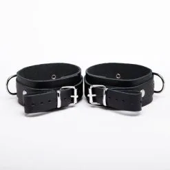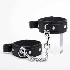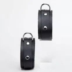 Menottes fines en cuir noir avec « sur » lanières rivetées et anneau en métal, de la « collection DEMONIA ».