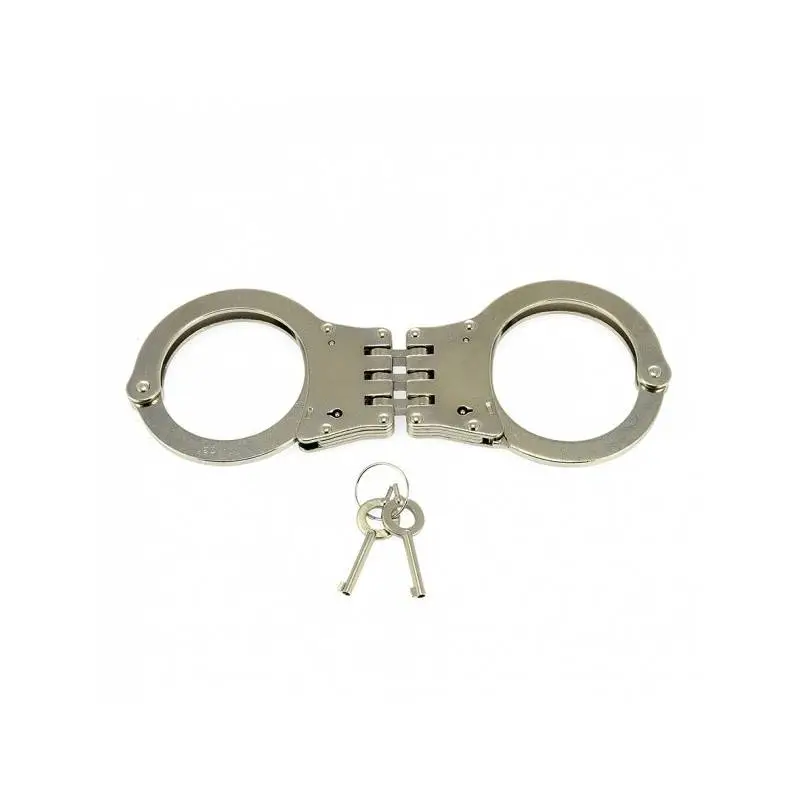 Menottes en métal (acier nikelé), avec charnières et clés pour les ouvrir.