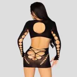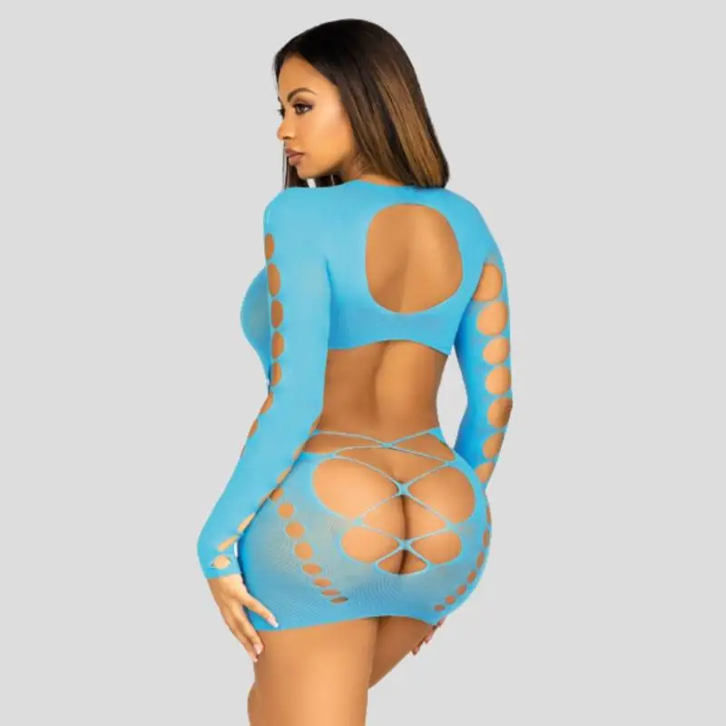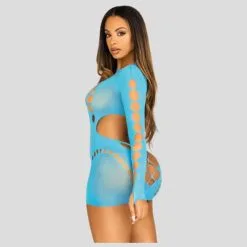 Cette mini robe est confectionnée dans un tissu sans coutures et extensible. Elle présente des découpes audacieuses sur les côtés de la robe et un faux lacet dans le dos. La robe est disponible dans une variété de couleurs (Existe en noir ou en bleu). Le string n’est pas inclus.