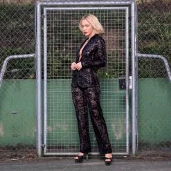 Apportez une touche de glamour Ă votre style toute l’annĂ©e avec notre pantalon noir en dentelle Ă sequins et rĂ©sille couleur peau, Ă la coupe droite et taille Ă©lastique pour un confort optimal. Associez-le Ă nos hauts en rĂ©sille ou lingerie, et pour un look complet, combinez-le avec notre blazer Rylee.