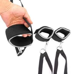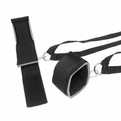 Sangles en nylon avec anneaux métal à chaque extrémité. Un petit mousqueton pompier relie la sangle à la menotte/chevillière. Celles-ci sont en nylon sur la partie extérieure, et doublées avec une bande en mousse pour un meilleur confort.