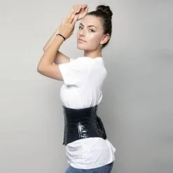 Serre taille très court en vinyle noir, baleines semi rigides, refermĂ© sur l’avant par 4 crochets et lacĂ© dans le dos.